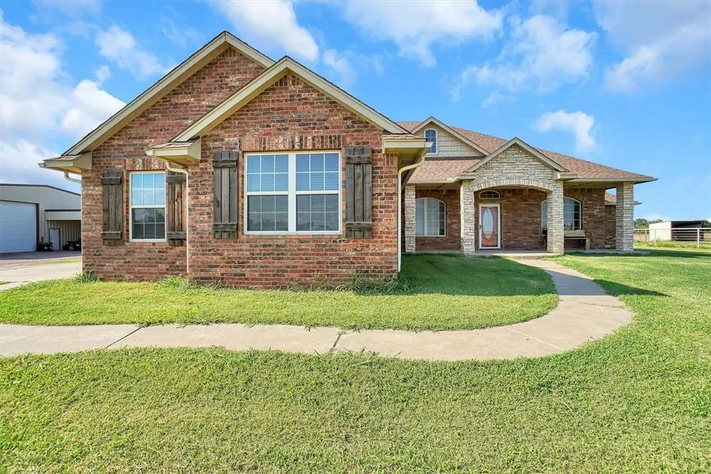 A dream place in the country for sale. This home has 3 bedrooms & 2 1/2 bathrooms with a beautiful open floor plan. Gorgeous Kitchen with beautiful cabinets & granite counter tops. Large formal dining room and beautiful living room with a fireplace. Nice size Master bedroom with a bay window. The other 2 bedrooms are good size. The Kitchen appliances stay with the house along with a water softener. House is total electric all but the fireplace, hot water heater, & the cook stove they are propane. Nice size Office . There are wood shutters through out the whole house that are beautiful. Storage and more Storage also the 2 car oversized garage has a cellar in it. The roof was replaced in 2021. This 55 Acres MOL has had a wheat crop on it plus grassland. The 50x80 Barn is double insulated with 2- 15 ft overhead doors with a basketball goal & retractable batting cage within it. 25ft lean to attached to the back of the barn for storing large equipment. Plus a 20x40 double insulated barn with Electric & water in it. Off the front of barn is a lean to for about 2 vehicles. All the barn measurements are approximate. Also that comes with all this is a 2005 Solitaire double wide manufactured home with 3 bedrooms & 2 bathrooms . All electric but has a wood fireplace. Covered front porch . Large Hay barn or equipment barn 80x45 and another 30x40 barn. This place just has to be seen it has a lot to see.