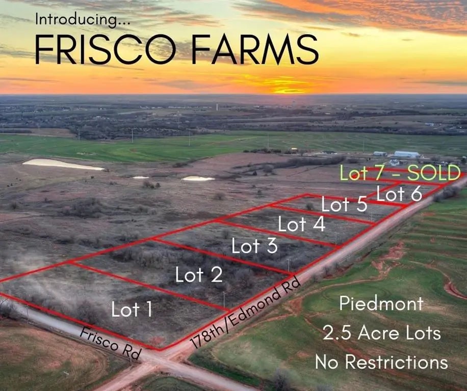 Here’s your chance to own one of just seven coveted lots off 178th and Frisco. Lot 4 is a spacious 2.5-acre property just waiting for your dream build—no size or builder restrictions mean limitless potential. Enjoy the beauty of Oklahoma’s wide-open skies, with Downtown OKC’s skyline on the horizon. Located in the Piedmont School District, this property perfectly blends peaceful country living with the practicality of nearby urban amenities. Whether you envision a large family home, a hobbyist’s dream, or a private retreat, this lot delivers the ideal backdrop for your future. With only six lots remaining, don’t wait to start building the life you’ve imagined!