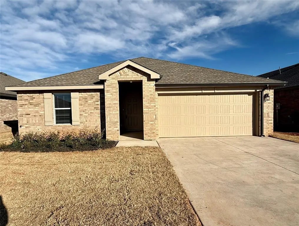 The Justin is a charming single-story, 1,831 square feet, 4 bedroom, 2 bathroom, 2-car garage layout. This open concept plan is perfect for entertaining. The welcoming entry leads to two bedrooms and a secondary bathroom. The Justin offers a large kitchen with a large island, quartz countertops and walk-in pantry. The kitchen features Whirlpool Stainless Steel appliances and a gas range as well as a spacious dining area, perfect for meals. A beautiful bedroom on suite is located at the back of the house for complete privacy. Additional features include a tankless hot water system ensures you'll always have hot water when needed. “Home is Connected” smart home features which include a camera doorbell, Kwikset keypad lock, smart switch, and Alexa Dot for voice control. The exterior features include full sod yard with a landscape package in the front, and a covered patio! The Brook offers the perfect blend of country living and convenient access to the big city. Located just 7 minutes west of the Turnpike and Northwest Expressway, this home offers an easy commute to major employers and all the amenities the city has to offer. The community offers splash pad, gazebo and park!
