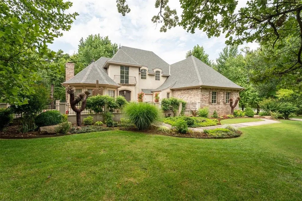 Exceptional custom home in the exclusive gated Edinborough Pointe Community. This Edmond home with its exquisite curb appeal is beautifully situated on a wooded private 1.4 acre lot. Owner transferable Invisible Fence for your pet has been installed. As you approach the front entryway the beautiful manicured gardens lead into a private brick and rod iron courtyard. Entering through the grand front doors you are welcomed by an open living concept with large windows that drench the home with natural sunlight, tall ceilings, and french doors that lead out to the wraparound patio. The living area features a custom wet bar and stone fireplace. Dining room leads into the upscale gourmet kitchen with eat in bar, custom floor to ceiling cabinets, new granite tops, a six burner gas stove, double ovens and a coffee bar. The primary suite features a large bathroom with two walk-in closets. This home features a beautiful office with walls of windows and built-in shelving. Off of the kitchen is a living room/morning room with french doors that open to the beautiful side yard. The upper level includes two oversize bedrooms connected with a Jack and Jill bathroom and a fourth bedroom/flex room with full bath that is being used currently for a theater room. There is additional storage in the upstairs area and large landing that overlooks the down stairs living area. This home has been beautifully updated with granite/quartz countertops throughout the house, new plumbing and electrical fixtures, new paint, added cabinets in office and kitchen, refurbished wet bar, new carpet upstairs, tornado shelter, and much more. This house is a beautiful home for entertaining and relaxing, a must have! Agent is owner.