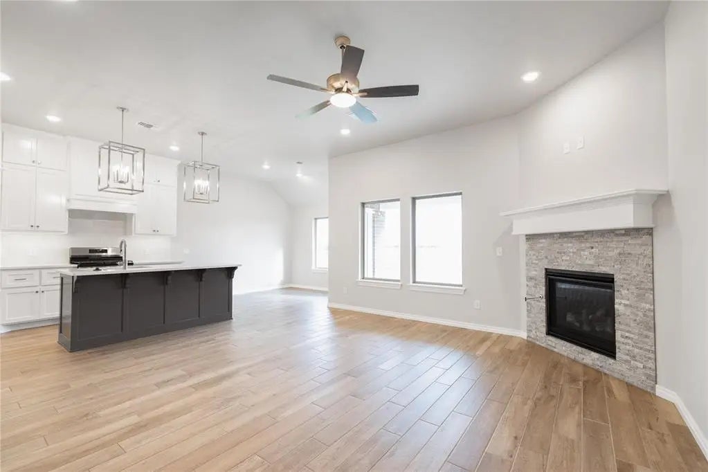 FENCING AND BLINDS INCLUDED! This Drake floorplan features 1,745 Sqft of total living space, which includes 1,550 Sqft of indoor space and 195 Sqft of outdoor living. This lovely home offers 3 bedrooms, 2 full bathrooms, 2 covered patios, a utility room, and a 2-car garage with an in-ground storm shelter installed. The living room presents 10' ceilings with a ceiling fan, large windows, Cat6 wiring, wood-look tile, and a stacked stone surround gas corner fireplace. The elegant kitchen features a large center island with a work station sink, custom-built cabinets to the ceiling, a corner pantry, stunning pendant lighting, more wood-look tile, stainless steel appliances, modern tile backsplash, and 3 CM countertops. The primary suite supports a sloped ceiling detail, windows, a ceiling fan, Cat6 wiring, and our cozy carpet finish. The prime bath holds a dual sink vanity with framed mirrors, a free-standing tub, a private water closet, a walk-in shower, and a HUGE walk-in closet. Head outside and enjoy the covered back patio has a wood-burning fireplace, a gas line, and a TV hookup. Other amenities include our healthy home technology, a tankless water heater, R-44 insulation, an air filtration system, and more!