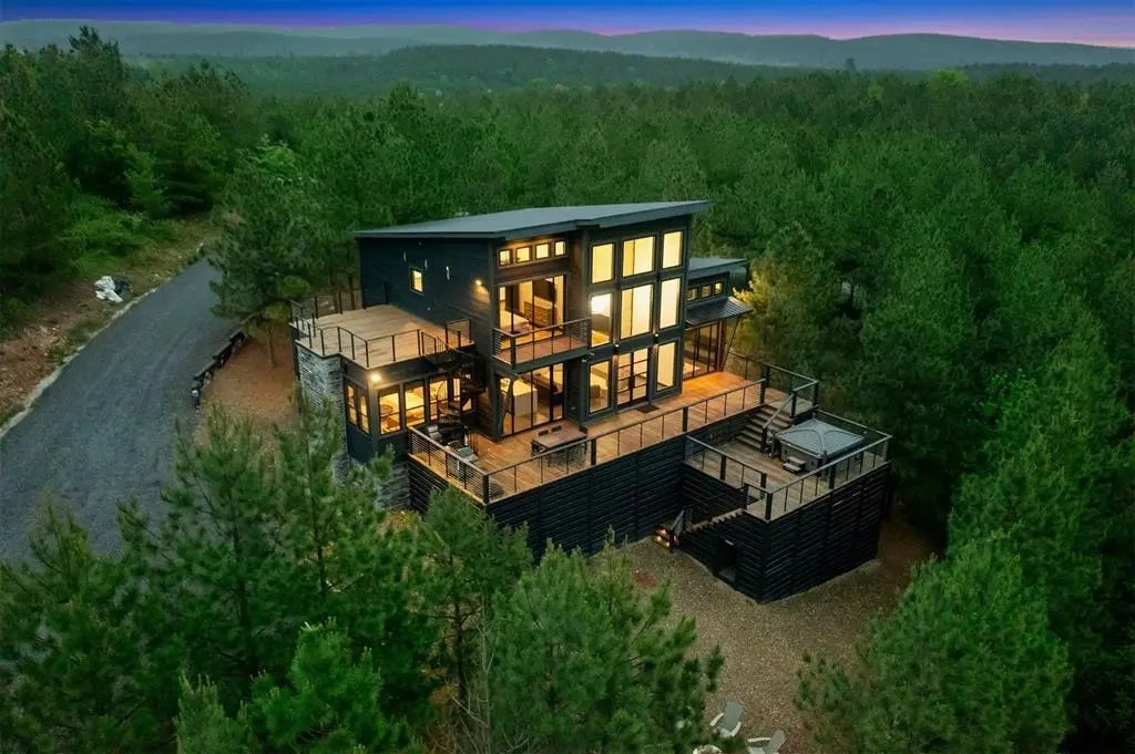 Discover the perfect blend of modern luxury and natural beauty in this stunning cabin nestled atop a ridge in the prestigious Woodland Bluffs. Spanning over 2 acres, the property offers unparalleled long-range mountain views, enhanced by expansive floor-to-ceiling windows that fill the space with natural light. Designed for both comfort and style, the home boasts premium appliances, high-end finishes, and smart home technology. Enjoy peace of mind with a private gated entrance and monitored security cameras. The thoughtfully designed layout features a secluded primary suite on its own wing, complete with floor-to-ceiling windows and motorized blinds for effortless light control. A storm shelter adds an extra layer of security beneath the suite. On the opposite side, the spacious bonus/game room offers a perfect spot for indoor entertainment, while upstairs, additional bedrooms provide ample space for family or guests. Kids will love the "Ninja Warrior" inspired jungle gym, while adults can relax in the luxurious Marquis hot tub with a motorized cover. Outdoor living is elevated with a generous deck for lounging and entertaining, along with a secondary rooftop deck accessed via a spiral staircase, offering panoramic views. The cabin comes fully furnished with elegant pieces from West Elm, Pottery Barn, and Restoration Hardware, complemented by custom accent walls and hands-free toilets. Additional features include a built-in wine fridge and ample outdoor living space, making this property a true retreat. Whether you're seeking a peaceful escape or a luxurious mountain getaway, this turn-key cabin offers it all.