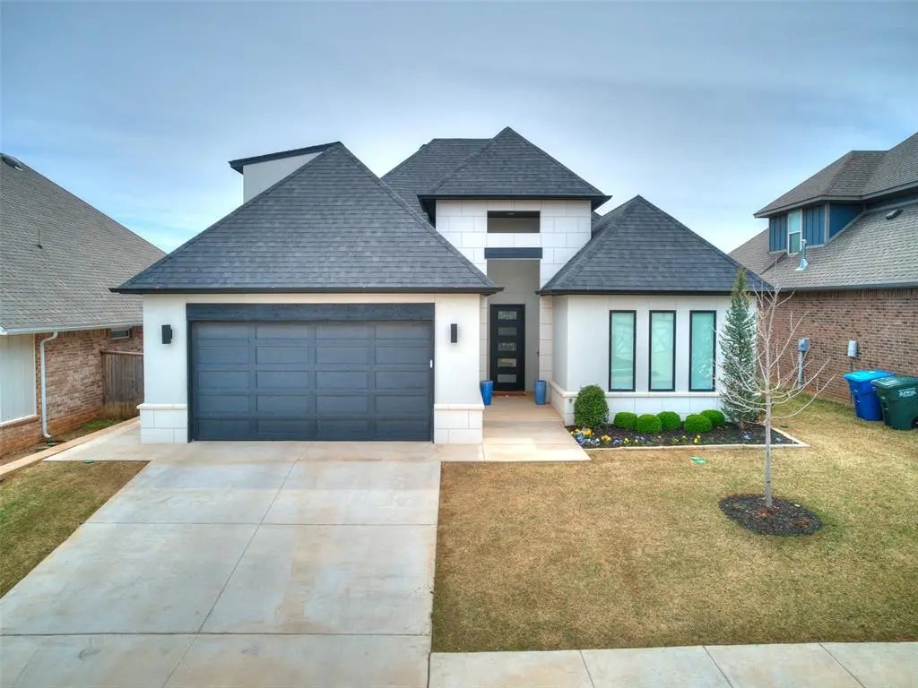 Welcome to this elegant two-story home located in the desirable Lakes at Cross Timbers neighborhood. Built in 2022, this better-than-new construction has been thoughtfully upgraded and meticulously maintained. With 4 bedrooms, 3 full bathrooms, and a convenient half bath, the home offers the perfect layout for comfortable family living and effortless entertaining. The spacious downstairs primary suite features a spa-like en suite bath, creating a private retreat. A second downstairs bedroom includes a dedicated full bath with a walk-in shower—ideal for guests or multigenerational living. Upstairs, you’ll find two additional bedrooms and abundant closet space throughout. The bright, open floor plan is complemented by high-end finishes, including custom white oak built-ins and stunning maple wood floors throughout the lower level. A modern electric fireplace with glass rocks serves as a cozy focal point in the living area. The gourmet kitchen is outfitted with GE appliances, generous storage, and a walk-in pantry that includes an above-ground safe room for added peace of mind. Enjoy custom retractable window coverings throughout the home, adding both style and functionality. Step outside to the covered vaulted patio—perfect for relaxing or entertaining in the beautifully landscaped backyard. Additional features include a tankless water heater, built-in cabinetry in the garage, and a low-maintenance lifestyle supported by the HOA, which provides resort-style amenities such as a pool, workout facility, clubhouse, and lawn care. Don’t miss this rare opportunity to own a home that truly has it all—modern upgrades, thoughtful details, and a prime location in the coveted Edmond school district. Schedule your private showing today!