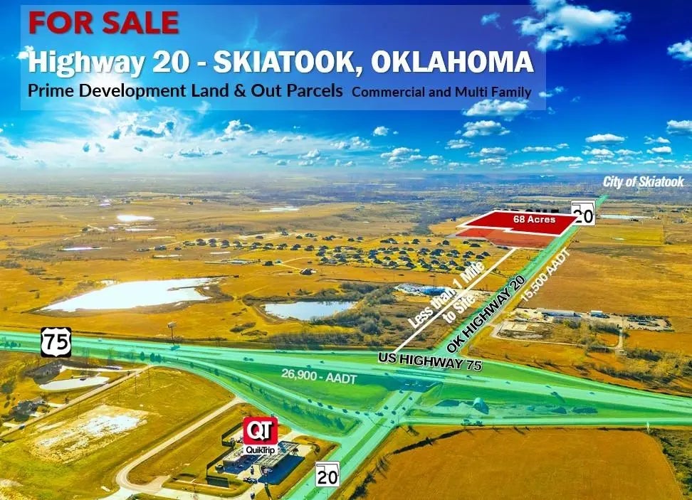 PRIME DEVELOPMENT OPPORTUNITY 30 +/- Acres in Skiatook City Limits! This already has MULTI FAMILY OVERLAY (LAND USE) approved by City of Skiatook property offers an exceptional development opportunity with prime visibility and accessibility. Tulsa County APN: 92328-23-28-45210 (9.66 acres) and 92329-23-29-14720 (59.41 acres). Water lines are at the property and ready to go. Situated directly off Highway 20, it benefits from a high annual average daily traffic count of 15,500 with population growth of 0.8% per year. The property is strategically located less than one mile from US Highway 75, providing easy access to major transportation routes. The property is fully equipped for development, with city water, electric, and gas readily available at the road. Its location is ideal for connecting to key destinations: just 15 minutes to both Downtown Tulsa and Tulsa International Airport, 30 minutes to the Tulsa Port Waterway, and within 25 miles of a trade school to support workforce development. Skiatook is a thriving community experiencing steady population growth. It features a public school system with high marks, a lower cost of living, and a lake-centered lifestyle, all of which enhance its appeal. As an up-and-coming town, Skiatook combines the charm of small-town living with the advantages of being just a short drive from a major metropolitan area. The property’s location at the crossroads of major highways makes it ideal for a variety of development opportunities, including retail, mixed-use, or industrial projects. Industry-specific incentives are available to further encourage business growth and investment. With its proximity to high-traffic routes, strong local infrastructure, and ample room for growth, this property is an unparalleled opportunity to be part of Skiatook’s bright future. Contact us today for more information and to explore the possibilities for this exceptional property.
