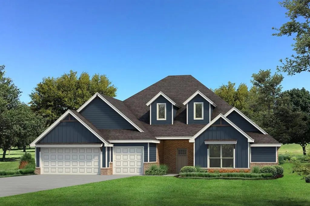This Rhody floor plan includes 3,590 Sq Ft of total living space, which includes 3,100 Sq Ft of indoor living space and 490 Sq Ft of outdoor living space. There is also a 590 Sq Ft, three-car garage with carriage doors and an in-ground storm shelter installed. This sensational home welcomes TWO primary suites, 2 secondary bedrooms, 3 full bathrooms, a half bath, a mudroom, a utility room, and covered patios. The living room presents a cathedral ceiling that extends from the living room to the kitchen, a ceiling fan, wood-look tile flooring, a 3-panel sliding door, Cat6 wiring, rocker switches throughout, and a stacked stone gas fireplace. The outstanding kitchen features stainless steel appliances, including double ovens and a 5-burner cooktop, custom-built cabinets to the ceiling, decorative tile backsplash, exclusive pendant lighting, 3 CM countertop, a walk-in pantry, and a kitchen island equipped with a trash can pullout. Both primary suites support a sloped ceiling detail with a ceiling fan, manicured windows, Cat6 wiring, and carpeted flooring. The primary baths welcome a free-standing tub, a separate sink vanity with framed mirrors, 3 CM countertops, tile flooring, a private water closet, a European walk-in shower, and huge walk-in closets. Secondary bedrooms sit at the front of the home, sharing a Jack-and-Jill bath and include walk-in closets, 10’ ceilings with a ceiling fan, windows, and carpeted flooring. Outdoor features include a wood-burning fireplace, a gas line, and a TV hookup. Other amenities include a tankless water heater, a whole home air filtration system, and so much more!