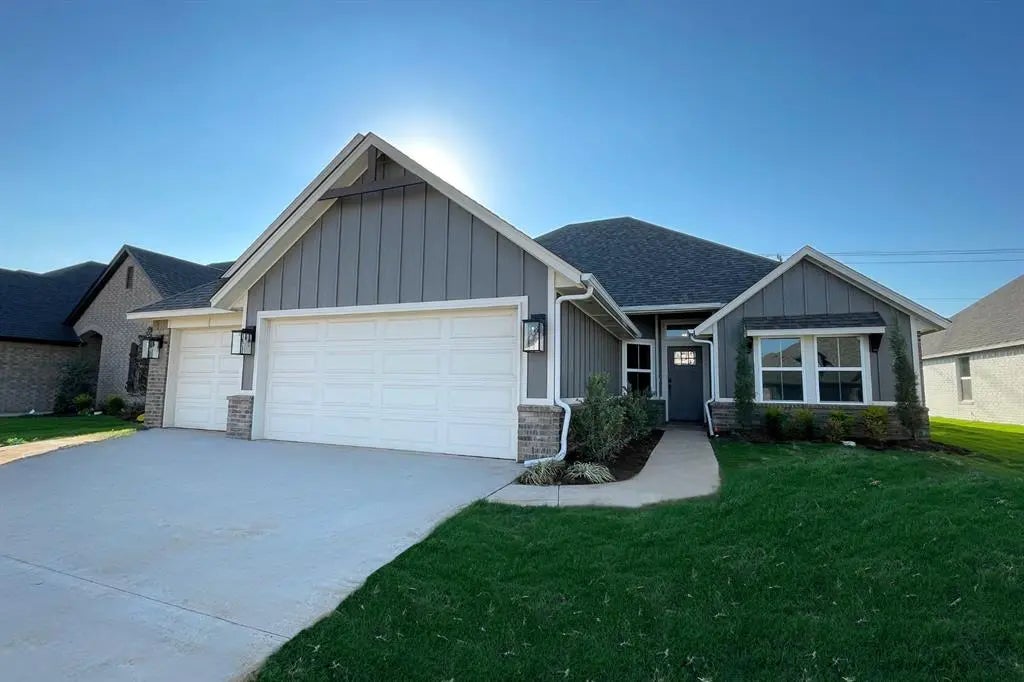 Completing by November! The Cherry Island at Castlewood Trails, located in the esteemed Yukon school district, features the Au Naturale interior design package, a versatile flex room, and a spacious 3-car garage. The open-concept layout offers a gas fireplace, wood-look tile floors, a large island with seating, quartz countertops, a pull-out trash bin, and a spacious pantry. The flex room is perfect for a home office, or hobby space. The primary suite includes a roomy walk-in closet and a luxurious bath with a 6-foot tub and Schluter waterproofed walk-in shower. Two additional bedrooms and a full bath are situated on the opposite side of the home. Additional highlights include a full sprinkler system, tankless water heater, and healthy air filtration system. This residence offers exceptional energy efficiency with 2"x6" walls, spray foam insulation, high-performance windows, ENERGY STAR appliances, and a post-tensioned foundation — delivering superior comfort, air quality, and long-term savings.