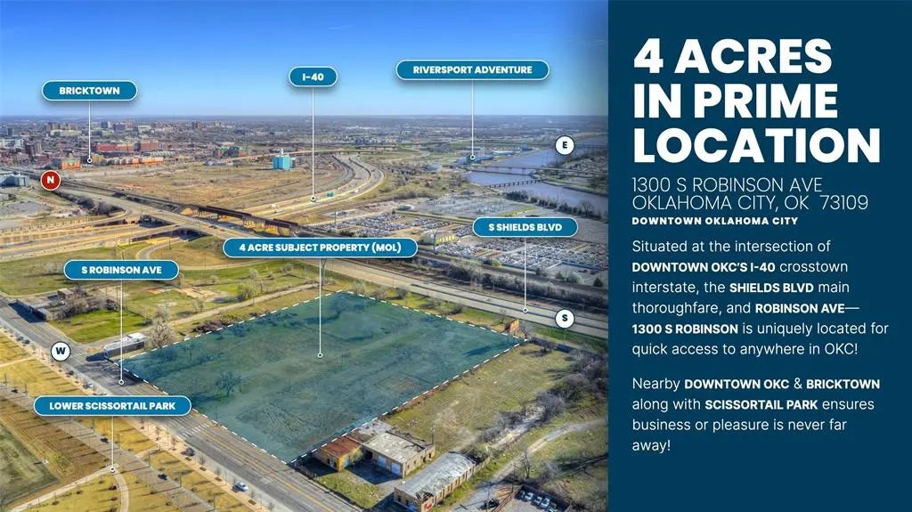 approximately 4 acres of valuable, excellent land for development. Ready to be reimagined, the owners have run a family owned business on the site for over 40 years, with every family member having a hand in its success. This property is fabulously situated in a premier location near the Oklahoma River, newly revitalized Scissortail Park, and I-40, featuring a steady stream of traffic and a successful urban core. Grab this impressive piece of real estate before it’s too late.