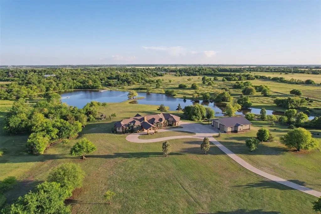 Escape to your own private paradise just minutes from the city in this one-of-a-kind luxury estate on 80 secluded acres in the coveted Yukon School District. Backing to a stunning 10-acre lake, this breathtaking 4-bed, 2.5-bath retreat is a sanctuary for nature lovers, complete with roaming deer, turkey, and endless wildlife. The main living area stuns with soaring ceilings, a striking floor-to-ceiling fireplace, and panoramic lake views. A second living room with its own fireplace offers cozy versatility. The gourmet kitchen boasts a massive island, gas cooktop, double ovens, and abundant storage, all anchored by a charming breakfast nook overlooking the water. The expansive master suite features a spa-inspired bath with double vanities, whirlpool tub, and an oversized walk-in closet. Work from home in the stately study with custom built-ins. Entertain in style on the covered patio with a full outdoor kitchen. A 3,000 sq ft (50x60) shop adds endless possibilities. With unmatched privacy, luxury finishes, and postcard-perfect scenery, this is more than a home—it’s a lifestyle.
