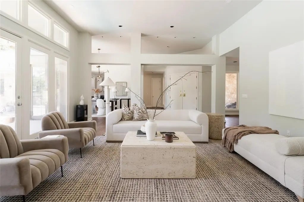 Priced $176,000 below recent appraisal, this exceptional home combines incredible value with timeless style. Set on over half an acre with scenic greenbelt views, this stunning contemporary home offers privacy light-filled spaces and a layout designed for living and entertaining. Floor-to-ceiling windows in the living and formal dining rooms flood the home with incredible natural light, while 12-foot ceilings and an open flow create a true sense of space. The remodeled kitchen features generous prep space, a breakfast nook, and views of the backyard. A massive family room with a built-in bar makes entertaining effortless. The primary suite is a true retreat with its own fireplace, sitting area, and a show-stopping mirrored dressing room in the ensuite bath. Each oversized bedroom features a private bath and walk-in closet. Outside, enjoy a sparkling pool and a full-size basketball/pickleball/tennis court, and an exterior half bath for convenience. A 3-car garage, extra parking, and a front portico add the finishing touches. Welcome home!