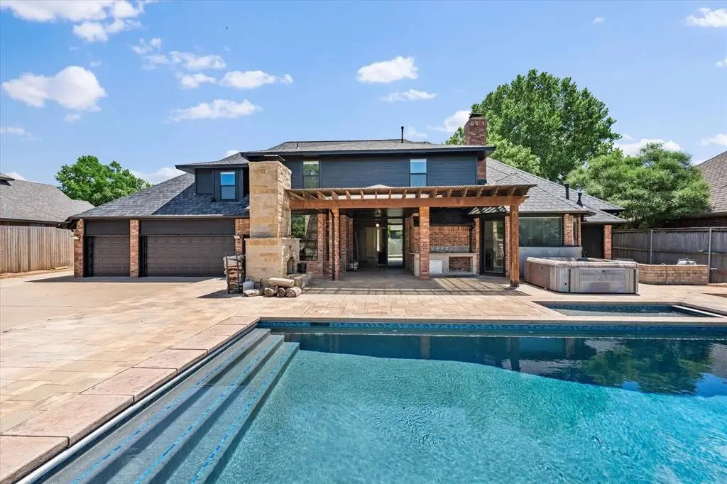 Welcome to this beautifully crafted 4-bedroom, 4-bathroom home, offering 3,907 square feet of living space on a serene, tree-lined street. This home’s classic brick exterior, mature landscaping, and circular driveway set a tone of refined sophistication. With a side gate for access to your 3 car rear entry garage. Family sized safe room is located in the garage. Inside, you are greeted with tall ceilings and open formal spaces with large windows with plantation shutters. Large living room with corner fireplace that has a sunken bar with a window that opens up to the patio, perfect for serving and entertaining. The large sliding patio door opens up wide to allow for a large opening to convert the outside in, and create the perfect party setting. Working from home is a pleasure in the dedicated wood-paneled office—private with glass French doors. The downstairs utility room is large with sink and counter, with an additional large storage closet. The master suite is located on the main floor with it's own sitting area with fireplace. The master bath offers separate shower and soaking tub, along with a large walk in closet. Remaining 3 bedrooms are generously sized, and located on the 2nd floor. Storage abounds throughout the home, with ample cabinetry, built-ins, and closet space to keep everything beautifully organized. Step outside to your own private resort: a sparkling saltwater pool, with a small wading pool perfect for the littles or relaxing in the water. Spend your evenings relaxing in the hot tub or next to the outdoor fireplace. Basketball goal on the back drive perfect for those neighborhood games.