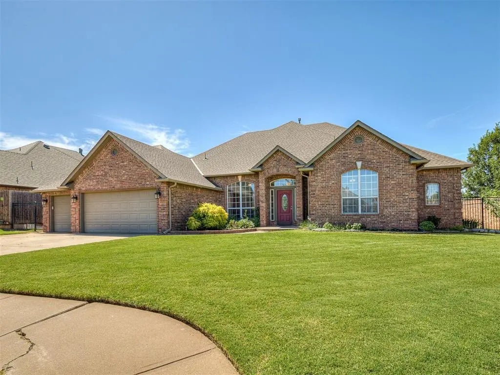 ALL NEW PAINT ON WALLS AND TRIM SEP 2025! Beautiful home in the highly desired Kingsway addition in Yukon! This 2,519 sq ft home has a fantastic layout with 3 bedrooms, a study with French doors, and a bonus room with French doors and a closet—perfect for a second office, homeschool space, game room, or a 4th bedroom. The spacious living room features a wall of tall windows overlooking the backyard, a gas fireplace, and built-ins. The kitchen is a showstopper with a stunning brick accent wall around the stove, plenty of cabinets, lovely built-ins, a breakfast bar for snacks or entertaining, and a pantry that doubles as a walk-in safe room right off the dining area. The primary suite is oversized with patio access, backyard views, and a fantastic en suite offering a soaking tub, tiled glass shower, private toilet room, double sinks with a vanity area, and a huge walk-in closet with a third row for hanging clothes. Two guest bedrooms are tucked on the opposite side of the home with a hall bath between. The study sits at the front of the home with built-ins and a large picture window for great natural light. There is also a half bath for guests. Outside, enjoy a huge covered patio with additional patio space, a nice-sized yard, and an outbuilding for lawn equipment or storage. The 3-car garage includes a storm shelter, and the neighborhood offers a basketball court plus an ideal location close to schools and major roadways.