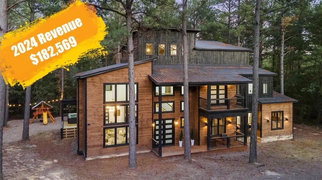 Experience the charm of this tri-level cabin that promises an unforgettable stay for up to 23 guests. The heart of the cabin is found on the first floor, featuring a fully equipped kitchen with stainless steel appliances and an elongated island with extra seating. A custom built in wine rack is a great place to keep wine on hand while making a statement. Cathedral ceilings with plenty of natural light that envelopes the dining area and living room through the large windows. Let the warmth of the remote-controlled fireplace embrace you while you relax in the contemporary living room. The laundry room features 2 stacked washers and dryers for convenience. The first floor also sets the stage for endless fun, boasting a game room with a ping pong table, a multi-game arcade, and shuffleboard – perfect for family game night! For those in search of tranquility, the first floor also offers three bedrooms. Each room is furnished with king-sized beds and spacious ensuite bathrooms for a rejuvenating stay. Ascend to the second floor to discover the first bunk room, equipped with a triple bunk (3 twin beds) and two additional king bedrooms with private balconies. Entertainment awaits with a basketball shooting game, electronic games, board games, and a TV sitting area. Another staircase leads to the second bunk room on the third floor, featuring five bunk beds (10 twin beds!) and its own TV sitting area. After a day filled with excitement, unwind in the hot tub on the covered deck or catch the game on TV while staying warm with the outdoor fireplace. This grand luxury cabin is nestled among towering pines, complemented by a fire pit for roasting marshmallows and creating s'mores. Picture the captivating tales spun under the starry night sky around the crackling blaze! Located just minutes from Hochatown and Beavers Bend State Park, your adventure awaits.
