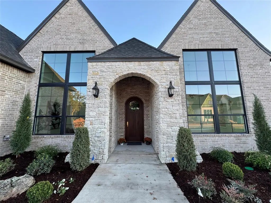 Beautiful natural stone and brick combine to create the striking exterior of this luxury French Countryside dream home! Enter through the beautiful arched front door into a stunning foyer with a barrel ceiling - the perfect introduction to the elegance found throughout. If you love high ceilings and natural light, this home is perfect! Soaring 12 ft ceilings and expansive windows in the living and kitchen flood the open-concept space with sunshine and warmth! The gourmet kitchen offers an oversized island, a dedicated coffee bar, and walk in pantry. The GE Cafe white & gold appliances, including the fridge, add a perfect blend of beauty and function.