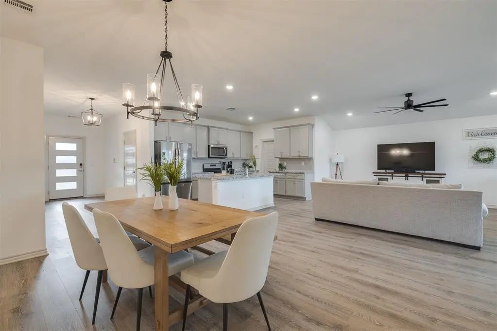 Welcome to one of DR Horton's most unique and versatile floorplans! The "Holden" plan is a thoughtfully designed, single-story home featuring 4 bedrooms, 2 bathrooms, a formal study, and a spacious 2-car garage. Upon entering, you'll find the secondary bedrooms, a full bathroom, and a conveniently located laundry room down the hall to your right. From the entry, the home opens up to a spacious, open-concept kitchen that boasts a large walk-in pantry, stainless steel Whirlpool appliances, and a 5-burner gas range. The expansive kitchen island doubles as a breakfast bar and is complemented by a designated area for a formal dining table adjacent to the living room.