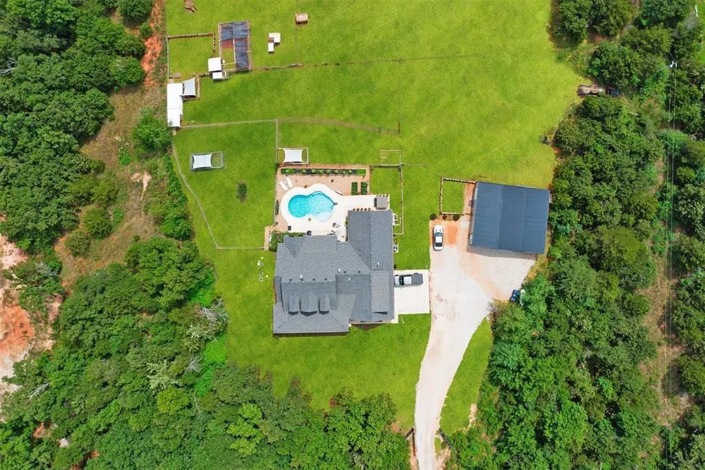 Welcome to this stunning 5-bedroom (plus office w/closet), 3-bathroom, custom built home with an in-ground pool, and shop all situated on a peaceful 5-acre lot. Offering 2923 sqft of luxurious living space, this home is designed for comfort and convenience. Upstairs, you'll find a versatile bonus room perfect for a home office, playroom, or media space. While the upstairs flex room can serve many functions, it is currently serving as the 5th bedroom. Downstairs the other 4 bedrooms and office are laid out with intention and flow in mind. The spacious primary suite features a large walk-in closet, a luxurious bathroom with heated floors, a whirlpool tub, and direct access to the back patio. The laundry room, conveniently located off the primary suite, adds to the ease of daily living. The whole home water softener and walk-in carpeted safe room provide additional peace of mind and functionality. Step outside to your private oasis, featuring a heated pool and hot tub, perfect for relaxing and entertaining. The screened-in patio, wired for a TV and plumbed for gas, is complete with a gas log fireplace, creating a cozy setting for year-round enjoyment. The property also includes a 30x40 foam insulated shop, oversized garage with beautiful epoxy floors, chicken coop and shed, offering plenty of storage and space for outdoor hobbies. The driveway is chip and seal, ideal for enhancing traction in all weather as well as extending the life of the driveway. While enjoying the property you will find will blackberry bushes scattered throughout as well as thornless blackberries, strawberries, and grapes near the house. Whether you're enjoying the serene surroundings, hosting gatherings, or relaxing by the pool, this home offers an unparalleled lifestyle. Conveniently located between I-40 and Hwy for easy access to downtown, Norman, or Shawnee. **GUN SAFE and POOL RELATED EQUIPMENT/ACCSSORIES stay with acceptable offer**Don't miss your chance to make this dream home yours!