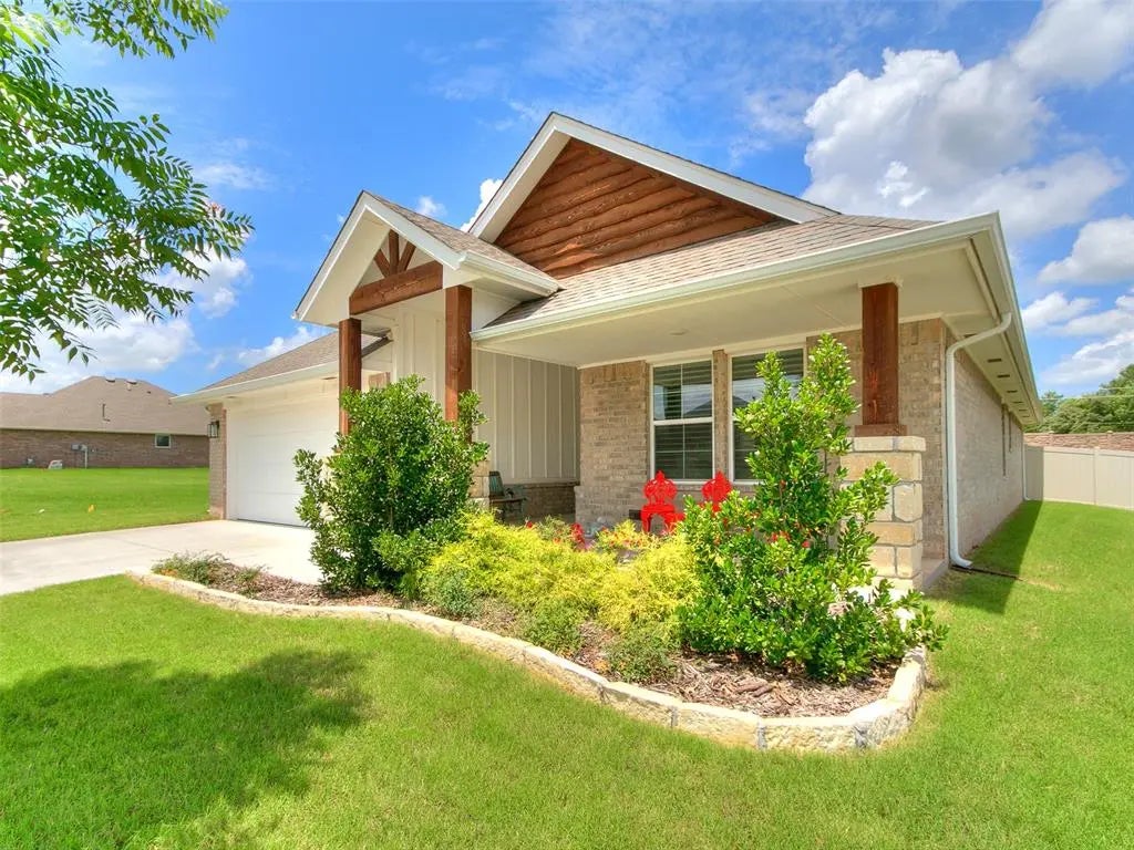 Like new two-year-old gently lived in Norman home in the beautiful Hallbrooke addition, and convenient access to all Norman & OKC areas have to offer. With a functional open and split floor plan you'll find a pass thru study, gorgeous kitchen with a massive island, large walk-in pantry, beautiful quartz countertops, stainless appliances, tons of cabinets with ample storage and under cabinet lighting. Off the kitchen and open to the living room is a spacious dining area. The home features large windows allowing natural light, ceiling fans throughout, cozy electric fireplace with a remote feature, and wood look tile in main areas. The primary bedroom is roomy and attached bathroom with a double sink vanity, glass shower, separate tub, and large walk-in closet. Second and third bedrooms currently used as sewing rooms are situated between the guest bathroom with tub & shower combo. Enjoy the inviting covered front porch and relax on the covered back patio with a ceiling fan and gas hookup for grilling, while listening to your soothing and very own rock waterfall. You'll also appreciate sprinklers to help maintain the yards, full gutters, and a maintenance free vinyl fence for backyard privacy. And rest easy with a STORM SHELTER in the garage floor!