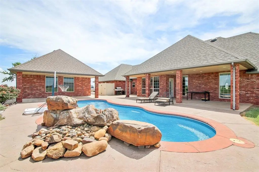 $2500 preferred lender credit. You won’t find a scratch in this custom-built beauty, set on 2 peaceful acres in the desirable Amber-Pocasset School District! This immaculate 3-bedroom, 4-bathroom home features a dedicated office and an upstairs bonus room—ideal for remote work, guests, or extra living space. Built to last with 50-year shingles, it also includes a storm shelter in the garage for peace of mind. Step outside to your private backyard oasis with a sparkling fiberglass pool and a pool house complete with a half bath—perfect for summer entertaining. Every inch of this home has been thoughtfully designed and meticulously maintained, offering the perfect blend of comfort, function, and outdoor living