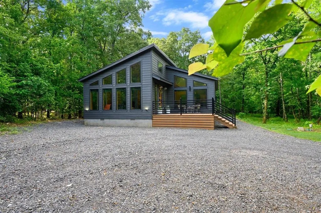 Built in 2022, the cabin still feels brand new, showcasing minimalist design with quality furniture and finishes, including pine tongue-and-groove walls and ceilings, LVT flooring, and a spa-style bathroom with a soaker tub and rainfall shower for two. The kitchen features stainless steel appliances with a washer and dryer behind closed doors. This property has never allowed pets, offering buyers peace of mind that the home has been meticulously maintained with an added sense of cleanliness.