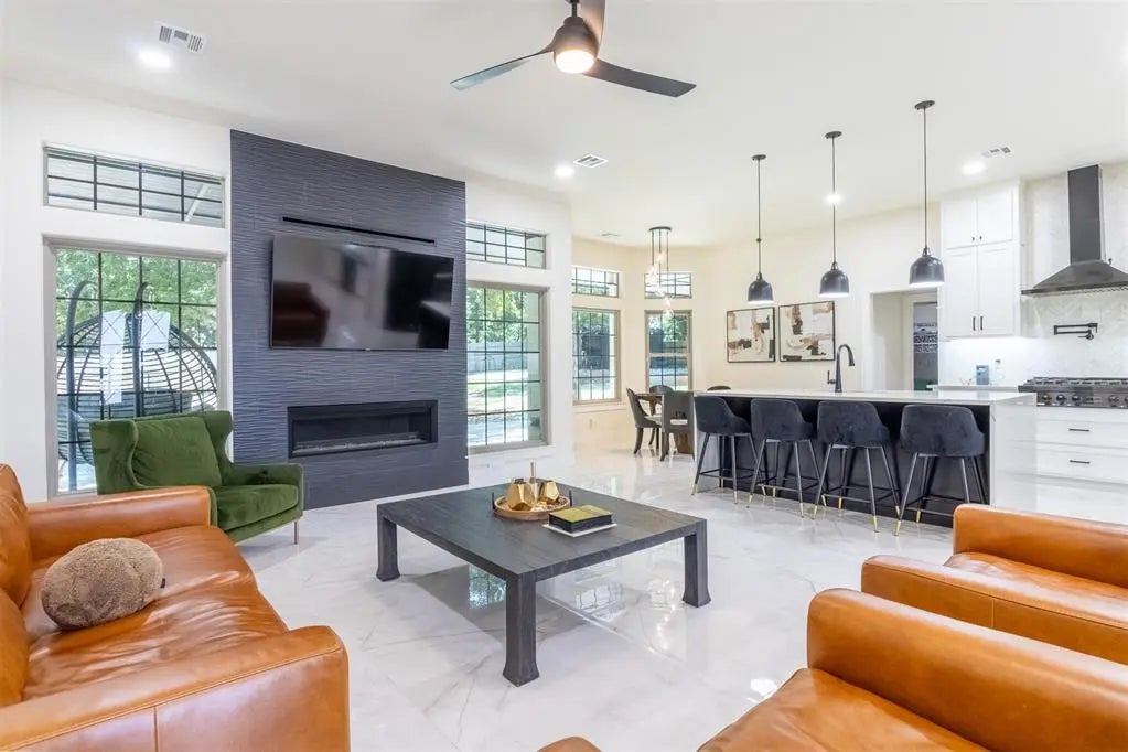Exceptional professional entire home remodel sits on 1.25 acres mol so you can spread out while being close to major highways. Completely surrounded by pipe and cable fencing there is plenty of room for entertaining on the extended patio or volleyball on the sand court or even work out or tinker in the 410' outdoor building complete with a mini split. The recently installed french drains take the torrential rains away from the house. Inside welcomes you with porcelain tile throughout and an open floor plan. The office could be a 5th bedroom with the closet with built-in drawers. The spacious living with an abundance of natural light from the wall of windows and the dining area is open to the eat-in kitchen with seating at the expansive bar. Built-in oven, microwave, vent hood and stove is complete with a pot filler & walk-in pantry. The dining area has a built-in bar with wine refrigerator. The first spacious primary suite with a wing of it's own has a spa like ensuite with fog-free mirrors, a soaking tub, walk-in shower, double sinks and a beautiful walk-in closet with tons of storage. On the other side of the house is a 2nd primary with ensuite with double vanities, walk-in , shower & closet plus a soaking tub. The 2 secondary bedrooms both have walk-in closets with dressers and are connected by a Jack-N-Jill bath with double vanities and kick lighting. This exceptional home also has a tankless hot water heater, 4 outside ranch faucets, a sprinkler system that sprinkles the entire acreage and a class 4 shingled roof replaced in 2023. The garage can fit 5-6 cars with a tandem arrangement plus is heated and cooled with it's own unit. Close to major highways leading to Oklahoma City, Norman, OU, hospitals, FAA, TAFB, shopping, entertainment and all the amenities surrounding cities have to offer. Schedule your personal showing today. This is a home you will not want to miss.