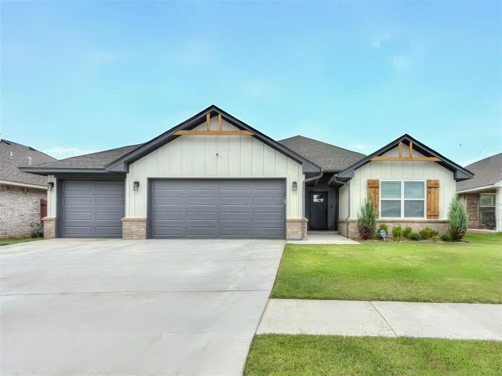 Welcome to this gorgeous, well-crafted home completed in 2024, located in a beautiful neighborhood. This 3-bedroom, 2-bath home offers modern design and comfort, featuring builder upgrades and timeless style throughout. The open-concept layout offers great flow and generous living spaces, including a large living room with a sleek modern electric fireplace, wood-look tile in the main areas in a perfect wood tone that brings warmth to any modern space, soft carpet in the bedrooms, and modern yet timeless ceramic tile in the bathrooms. A covered back patio provides the perfect spot to enjoy your morning coffee. Designed to impress, the kitchen features a center island perfect for food prep and casual dining, with seating for 2 to 4 depending on stool size; custom maple cabinetry painted a sleek dark gray; quartz countertops; a timeless marble backsplash; stainless steel appliances; a direct vent hood over the gas range; elegant designer lighting; and a generous pantry. The laundry room, conveniently located off the kitchen, features a stylish wood folding table and built-in storage. Retreat to the primary suite, offering a large bedroom, double vanity, frameless glass shower with marble tile, relaxing garden tub, and a spacious walk-in closet. Spacious secondary bedrooms are equally comfortable, and there is easy access to a beautifully appointed hall bath featuring a fully tiled tub surround with a stunning herringbone design. Additional highlights include 2" faux wood blinds, a tankless water heater, a fully fenced backyard with plenty of room to play or garden, and a spacious 3-car garage. Conveniently located near shopping, restaurants, the highway, and the turnpike! Mustang Schools! Schedule your private tour today!