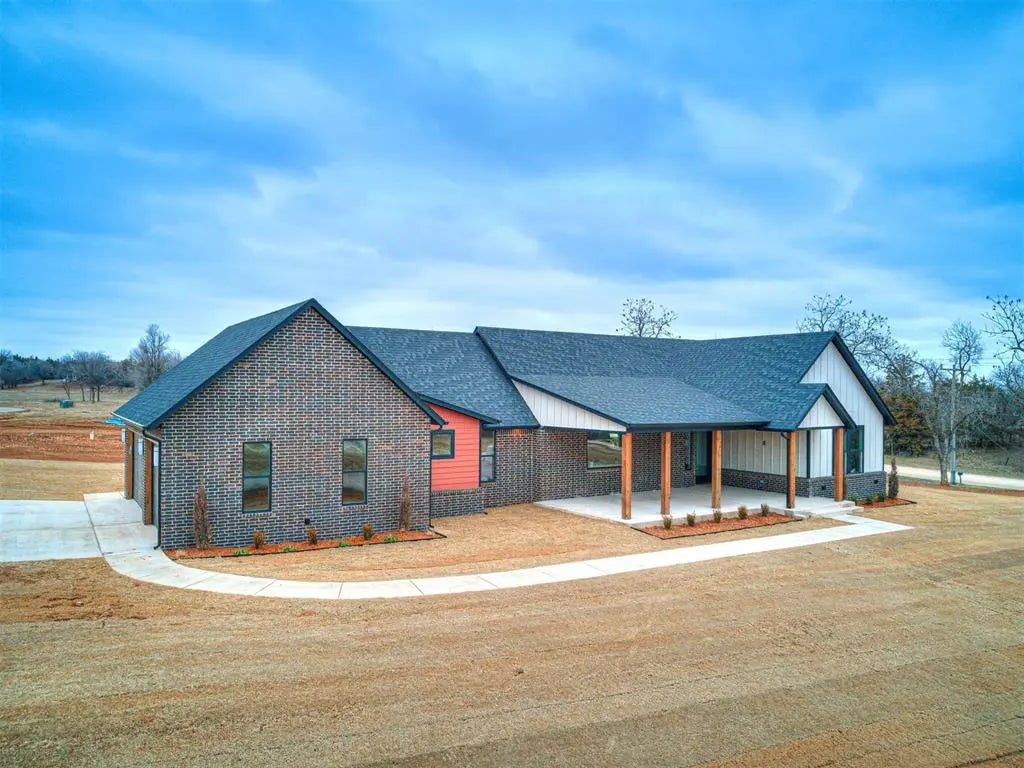 Modern farmhouse on a spacious lot featuring a mix of brick and board-and-batten exterior with wood beam accents. Inside offers open-concept living with vaulted ceilings, a double-sided brick fireplace, and designer finishes. Large covered patio, stylish dining area, and move-in ready comfort in a quiet neighborhood.