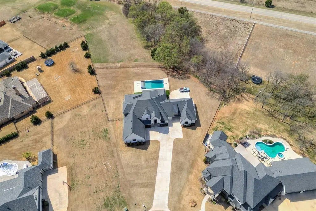 Tucked at the end of a tranquil cul-de-sac in the prestigious enclave of Villagio, this newly constructed contemporary estate commands 2.9, where architectural precision meets warm, livable elegance. A dramatic two-story foyer, anchored by clean lines and curated finishes, opens to a gallery-like living space framed by a full wall of glass, revealing a resort-caliber retreat with a covered al fresco lounge, fully appointed outdoor kitchen, glittering pool and spa, and sculpted turf putting green—all embraced by the stillness of nature. The open-concept great room flows effortlessly into a state-of-the-art kitchen where a statement island clad in luxe stone invites gathering, while professional-grade appliances—including a large gas range, double ovens, and a built-in double-door refrigerator/freezer—are paired with a discreet walk-in pantry and innovative pass-through bar. A bespoke breakfast nook with custom booth seating offers an intimate yet elevated dining experience, and the dedicated office, framed by a hand-forged Monte Cristo iron door, exudes gravitas. The primary suite is a private sanctuary with its own exterior access and a spa-inspired bath finished in serene tones with dual vanities, a sculptural soaking tub, and a walk-in shower, while dual dressing rooms cater to the most refined collections with a seamless connection to the expansive laundry suite for effortless living. The main level also includes a gracious guest suite with ensuite bath, while the upper level reveals two additional suites, each privately appointed, and a versatile bonus lounge opening to a sweeping covered terrace overlooking the picturesque grounds. A porte-cochère drive leads to a detached two-car garage with an upper-level guest retreat, complete with full ensuite bath, ideal for multi-generational living or extended stays. A masterwork in modern design, this Villagio estate is more than a home—it is a statement of taste, privacy, and architectural artistry.