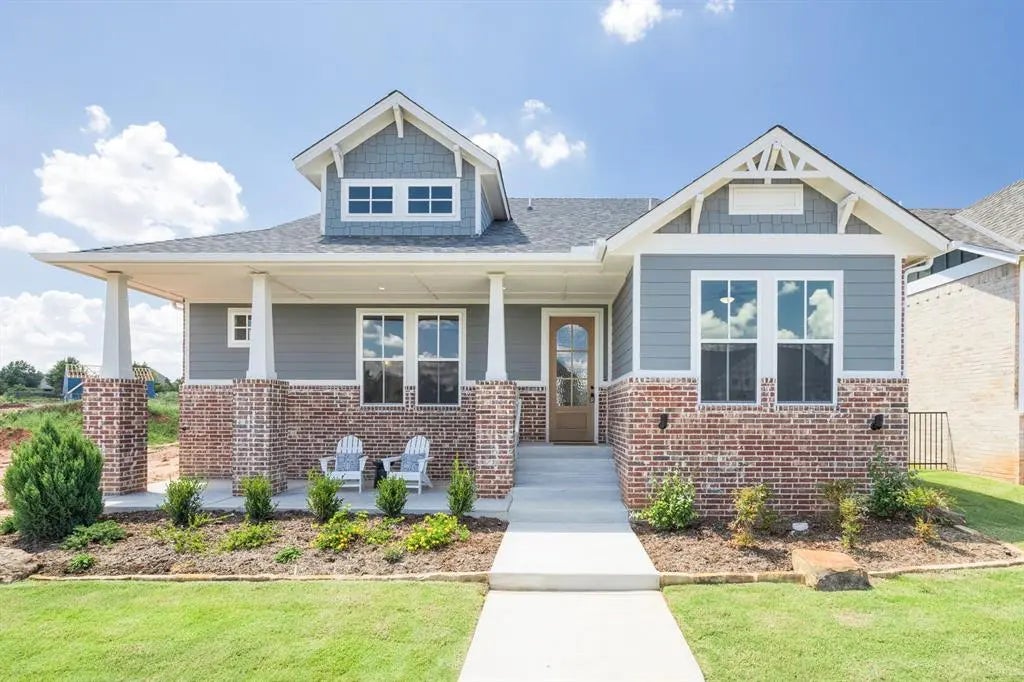This charming Craftsman-style home is move-in ready and located in the final phase of The Plaza at Town Square—Edmond’s premier historically inspired community! Thoughtfully designed with 2 bedrooms, 2 full bathrooms, and a private study with built-in cabinetry, this home is perfect for anyone looking to right-size without compromising on quality or style. The open living space features a cozy corner brick fireplace and flows seamlessly into the kitchen, complete with Bosch appliances and plenty of prep space. Town Square is a historically inspired community offering a greenbelt with walking trails, a lake with a fishing dock, a clubhouse, a resort-style pool, a fitness center, a youth recreation center, a community garden and a playground. Don't miss your chance to own this exceptional home in such a vibrant and welcoming community! Come experience the timeless charm and easy living of Town Square! Model Home located at 3717 Union Park Place, open daily.