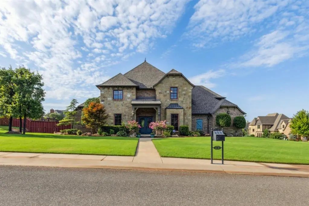 This home boasts an impressive living area with a soaring cathedral ceiling and wood beams, a striking stone fireplace, and stunning windows. The open-concept design seamlessly connects the living room, kitchen, and breakfast area. A spacious island serves as the perfect centerpiece for large gatherings, while a Butler's pantry with a wine bar is conveniently located between the kitchen and formal dining area. The upper-level media room and spacious game room with a small kitchenette make this an ideal home for entertaining. The master suite, an office, and a guest bedroom with a full bathroom are located on the lower level. Upstairs, you'll find two additional bedrooms, each with its own full bathroom. The master bathroom features a stunning dome ceiling with a beautiful chandelier and the master bedroom is enhanced by elegant coffered ceilings. Other bonus features include a large covered back patio with a fireplace, an in-ground storm shelter, and a full sprinkler system. The roof was replaced in 2024 with Class IV shingles, most of the fencing is new, and the sub-zero refrigerator and freezer in the kitchen are new. This is a special home full of warmth and functionality. Come see it today!
