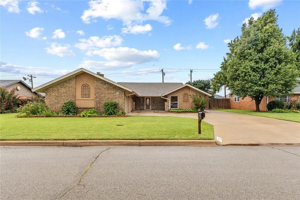 This beautifully maintained home has a warm and welcoming ambiance. It has a grand entrance that opens directly to the central living and dining area. The updated kitchen has excellent storage space and updated appliances. It opens to a cozy den with a wood burning fireplace with insert. French doors next to the eating bar open to a delightful backyard with open patio, storage building & beautiful flowerbeds. There's also a a basement room with central H&A for the ultimate storm shelter. All three bedrooms offer great space and storage. The door on the hall bath has been widened to accommodate a wheelchair & a custom sliding barn door has been added. The primary bedroom has patio doors that open to a second patio in the backyard, perfect for morning coffee. Located in a wonderful established neighborhood. Call today for your personal showing!