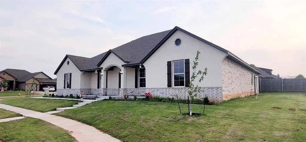 Welcome to Prairie Hills Estates, where comfort, style, and functionality come together in this truly beautiful home located in the highly sought-after Mustang School District. From the moment you arrive, you’ll be impressed by the home’s curb appeal—it’s the kind of property that immediately stands out with its charm and thoughtful design. Step inside, and you’re greeted by elegant tiled floors that flow throughout much of the home, creating a seamless and welcoming first impression. Perfect for a growing family or anyone who values space, this property offers a rare find: a true five-bedroom, three-bathroom layout, all conveniently situated on one level. Just off the entryway, you’ll find two bedrooms that can easily serve as guest rooms, offices, or hobby spaces. An additional bedroom is located near the oversized laundry room, paired with a full bathroom for convenience. On the opposite side of the home, another bedroom and full bath provide even more flexibility. The master suite is privately tucked away at the back of the home and is spacious enough to comfortably accommodate king-sized furniture. Its ensuite bathroom features a walk-in shower, relaxing jacuzzi tub, and a large walk-in closet—everything you need for a retreat-like experience. The heart of the home is the open living area, where the living room flows into a spacious dining area and chef’s kitchen. With abundant cabinets, extensive countertop space, a center island, and a walk-in pantry, the kitchen is designed for both everyday living and entertaining. Additional features set this home apart, including 9-foot-tall garage doors—ideal for large trucks or lifted vehicles—ceiling fans in every room, and a complete sprinkler system. The community itself offers sidewalks, streetlights, a playground, and a basketball court, and the location is close to shopping, the airport, lakes, and parks. With Samsung black stainless-steel appliances included, this home is ready for its next owner to enjoy.