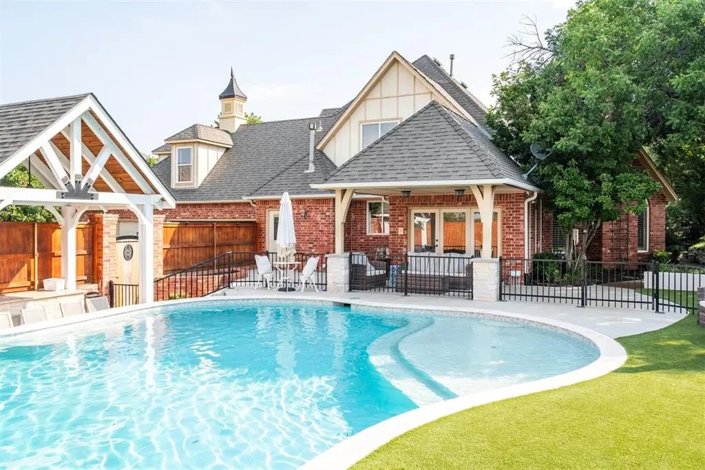 Exquisite Glen Eagles home blending timeless elegance with resort-style living. Recently remodeled, this home showcases a brand-new saltwater pool with swim-up bar, open cabana, and turf surround for year-round enjoyment—all privately enclosed with a safety gate and new exterior fence. Stately curb appeal with double front doors opens to a soaring foyer flanked by formal dining and living rooms. A private study with floor-to-ceiling bookshelves and abundant windows sets the tone for refined living. The main living area features a vaulted ceiling and seamless flow into the chef’s kitchen with bright cabinetry, granite counters, a large island, kitchen dining and hardwood floors that flow seamlessly throughout the first level. Walls of windows and French doors frame views of the new pool and landscaped backyard. The primary suite is a true retreat, boasting a newly remodeled spa-inspired bath with dual vanities, soaking tub, glass shower, and expansive closets. Upstairs, three spacious bedrooms (each with bath access) offer plenty of room for guest with room for additional play or retreat. The large versatile play/media room with half bath provides exceptional flexibility.