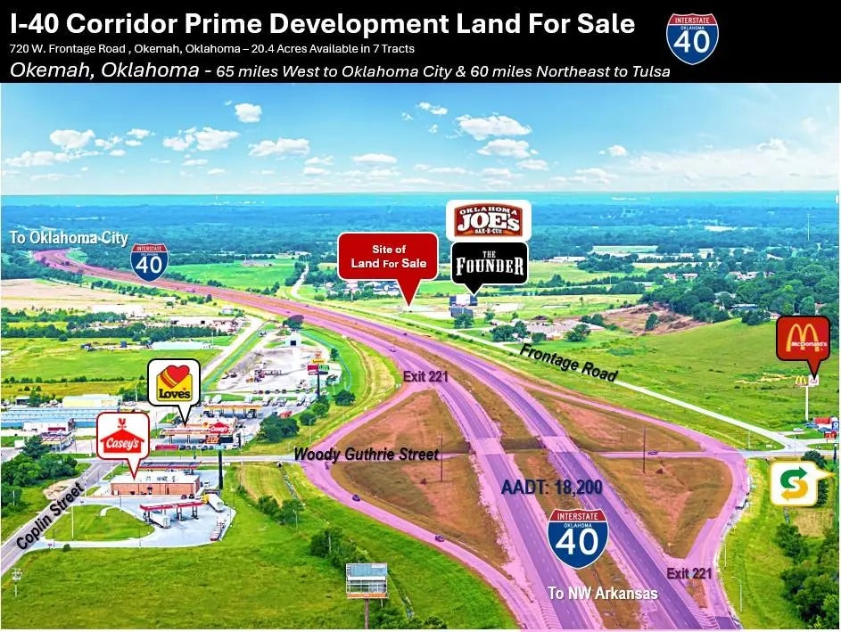 Outstanding opportunity to own the premier 6-acre tract along the I-40 frontage road in Okemah, Oklahoma. This new development offers unmatched visibility between Tulsa and Oklahoma City, with Fort Smith, Arkansas just 100 miles east—an ideal location to capture travelers, commuters, and regional traffic. With 18,500 vehicles per day (AADT), this site is perfectly positioned for high-exposure growth. The property is level at grade with mixed soil types, making it development-ready. A new access road will be constructed to ensure easy entry from the frontage road. Additional acreage—up to 20 acres total—is also available, giving buyers flexibility to scale projects as needed. Directly neighboring The Founder – Oklahoma Joe’s, one of Oklahoma’s most popular barbecue destinations, this site benefits from a built-in customer draw and brand recognition. Whether you’re envisioning a new retail center, light industrial building, farm and ag store, flex-based supply chain hub, or fleet storage facility, the visibility and access along Interstate 40 are unmatched. Okemah’s newest anchor—The Founder by Oklahoma Joe’s—has already established momentum, creating a natural hub for expansion and complementary businesses. With frontage, size, and strategic placement, this property is an excellent fit for retail, commercial, or service-oriented developments such as a farm and ranch retailer, hotel, UTV/ATV dealership, outdoor equipment dealer, or regional supply chain operator. With strong interstate traffic, local community support, and a high-profile neighbor, this 6-acre tract represents a rare chance to secure a prime location in a fast-emerging commercial corridor. Additional land is available, making this the perfect site for investors and developers ready to be part of Okemah’s next chapter of growth. Give us a call from 1.4 acres to 20+ acres available for your diverse needs!