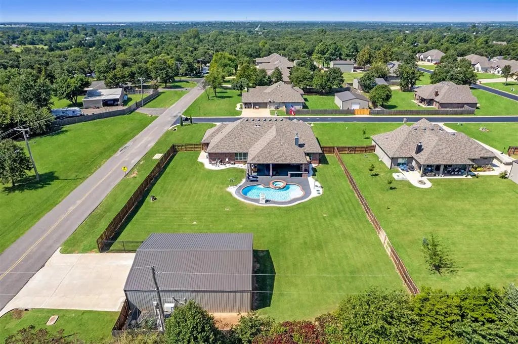 Unbelievable home in the Edmond School District on a spacious .82 acre lot complete with a sparkling pool and hot tub! This beautifully maintained home is packed with upgrades, including full sprinklers front and back, security cameras with 4K audio/video inside and out, professional landscaping with curbing, and full guttering. Permanent LED holiday lighting & eave lighting with timers make this home shine year-round. The inviting front porch features stamped and stained concrete that adds charm before you even step inside. Through the front door, a designated foyer opens into a light-filled, open-concept great room with expansive windows. A striking red brick gas fireplace with a dark wood mantle extends to the ceiling, while durable wood-look tile flows throughout the main living spaces. The kitchen is a showstopper with granite counters, double ovens, a built-in gas range, farmhouse stainless steel sink, walk-in pantry, and an additional prep island. A large counter-height island with seating connects seamlessly to the living area, and the dining space easily fits a full-size table. The primary suite is generously sized with oversized windows bringing in natural light. The ensuite is thoughtfully designed with heated floors, double vanities, a walk-in tiled shower, and a massive closet. Nearby, the laundry room includes space for a full fridge/freezer. Up front, a versatile bonus room sits next to a full bath perfect for guests. The opposite wing of the home features 3 more bedrooms: 1 with a private ensuite and walk-in closet, and 2 that share a hall bath. The backyard is a true oasis! Enjoy a fully equipped outdoor kitchen with gas grill, gas fireplace, mood lighting, & extended patio space around the pool. A 30x40 shop delivers with mini-split heat & air, full insulation with ½-inch plywood walls, shelving and cabinets, LED lighting with ambient sensors, 200-amp service with both 110v and 220v power & its own private drive access off Charter Oak.