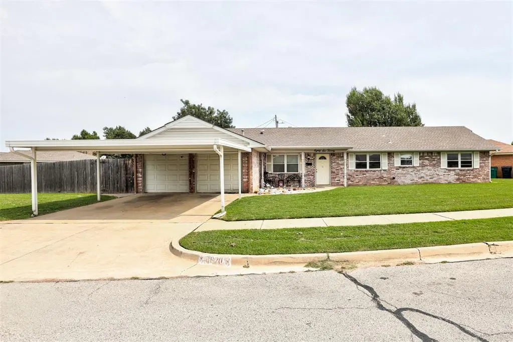 Moore School District! This 3-bedroom, 2.5-bath home sits on a large corner lot with quick access to I-44 and I-235. You’ll also be just a short walk from the park, splash pad, recreation center, and elementary school. The exterior offers a two-car carport plus garage parking. Inside, the flexible layout includes two living areas perfect for a home office or extra lounge space. The main living room features a wood-burning fireplace and French doors leading to the covered patio and spacious backyard. The kitchen includes a center island, plenty of storage, and easy access to both the garage and backyard. The private master suite has its own full bath, with another full bath down the hall and a convenient half bath near the kitchen. A standout feature is the climate-controlled two-car garage with an above-ground storm shelter. Outside, the oversized wraparound yard offers room to play and garden, plus a storage shed for tools and equipment. Additional highlights include ceiling fans in every room, a durable brick exterior, rain gutters, and a recently replaced hot water tank. With its spacious floor plan, large yard, and prime location, this home checks all the boxes. Schedule your showing today!