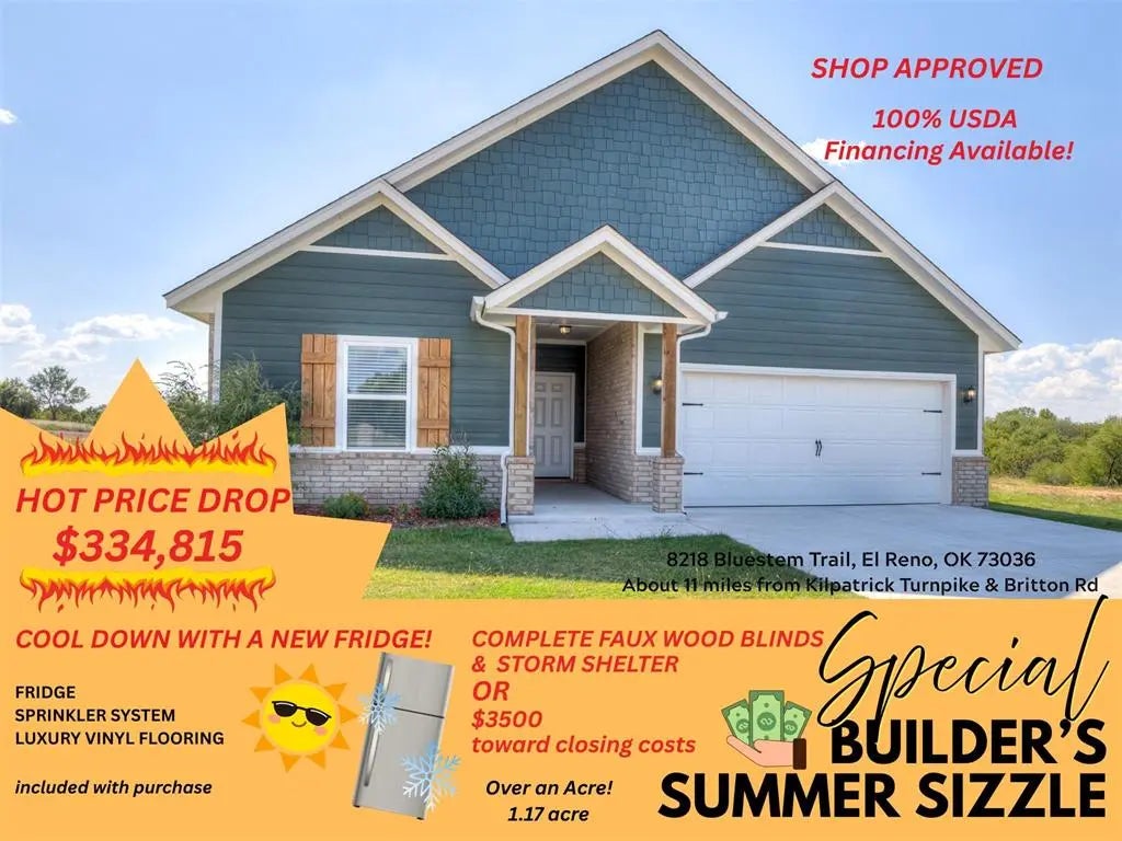 **Summer Sizzler event, cool down with a new fridge! Builder is including new fridge!*** OVER ONE ACRE LOT!!! **Also Builder is offering option of complete faux wood blinds & storm shelter OR $3500 in closing costs**This charming TRENTON Floor Plan has all the living spaces that you need for you and your family! This home prides itself with a very convenient open-concept layout and features 4 bedrooms with flex and bonus rooms, 2.1 baths and SPRINKLER SYSTEM. Enjoy all the amenities of this dream home that boasts of designer finishes throughout, luxury vinyl flooring, marble granite countertops, open living area that flows to the kitchen with massive island, corner pantry and now includes a refrigerator!!! Flex room in the first floor and a bonus living area upstairs that is ideal for entertainment space or kids' playtime area - the possibilities are endless! Home is in close proximity to I-40, shopping, dining and entertainment scenes of Yukon & El Reno! This could be the perfect home sweet home for you and your family!