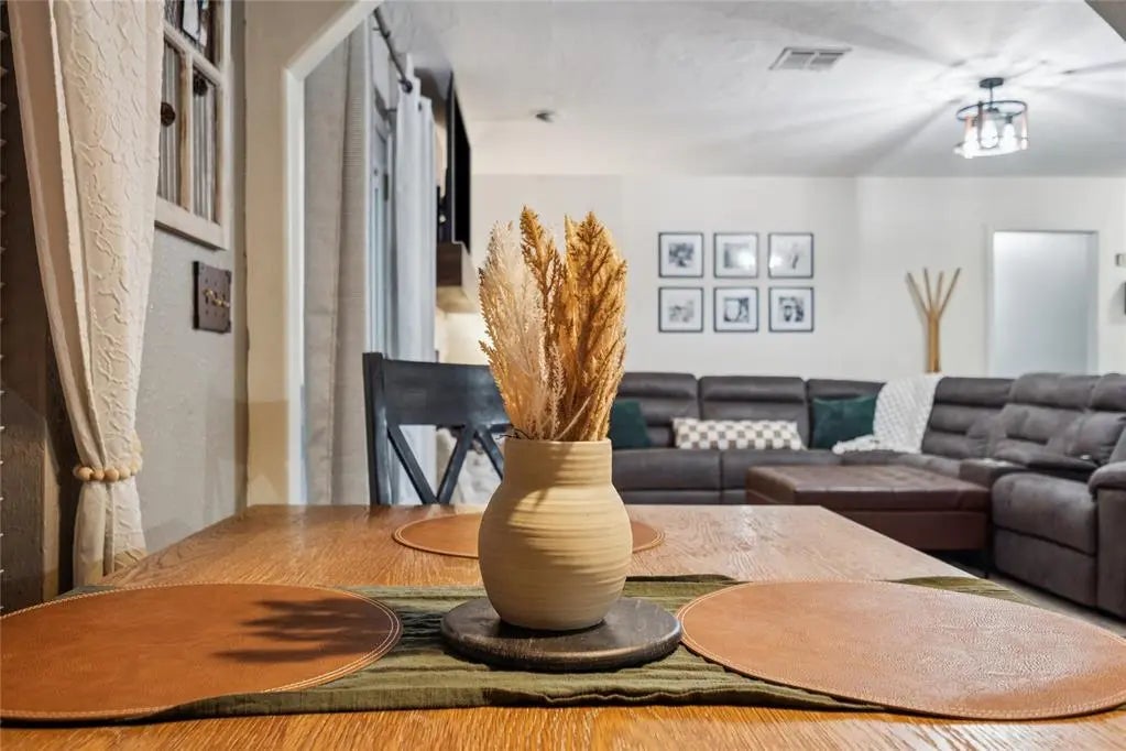Modern farmhouse with custom finishes in Noble! Living & dining feature fresh paint, new fixtures & custom shelves. Kitchen boasts granite, barn-door tile & new stainless appliances. Owner’s suite has a newly renovated walk-in shower. Backyard retreat offers a massive, covered patio w/ cedar pillars, updated electrical, privacy fence (2023) & hot tub w/ reasonable offer. Major updates: HVAC ’23, roof ’21, paint, fixtures & 1-yr home warranty.