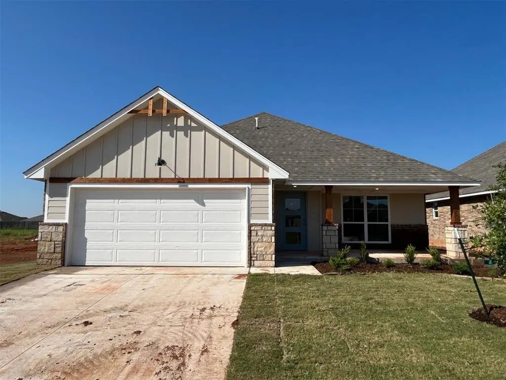 This home boasts great spaces, great attention to detail and energy efficiency! First of all, you will love the charming, large covered front porch! Beautiful and durable wood tile flows throughout all of the main areas. Spacious living room with a wonderful wood and stone fireplace. The kitchen is a chef's dream with a big island, thick quartz tops, custom cabinets, under cabinet lighting, decorative wood vent hood, stainless steel Samsung built-in appliances, farm sink and even a lazy susan! The primary bedroom is tucked into the back of the home with lots of natural light. Primary en suite features a raised two sink vanity, large tiled shower, garden tub and big closet with seasonal storage. The three spare bedrooms are on the other side of the home along with a nice sized bathroom. Covered back patio. This home backs up to an HOA maintained common area, providing extra space and privacy. Neighborhood amenities include a large playground, pool and clubhouse with fitness center and gathering hall!