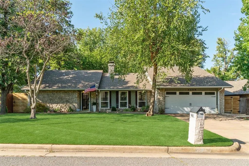 Welcome to this 4 bed, 3 bath home in Chimney Hill, surrounded by large trees and offering many neighborhood amenities. Inside, the front entry opens to a formal dining space that could easily serve as a second living area or home office, complete with a stacked stone fireplace that flows into the living room and kitchen. The main living area features wood beams, built-in shelves, and large windows overlooking the sunroom, which offers tons of natural light. The kitchen offers stainless steel appliances, ample storage, a built-in desk area, and a space for dining. Just off the kitchen, you’ll find a convenient laundry room and a fourth bedroom with its own full bath—perfect for guests. The primary bedroom includes a walk-in closet, oversized shower area, granite countertops, and beautiful views of the sunroom. Two additional bedrooms are located near the primary bedroom and offer plenty of storage. Don't miss the backyard with a large patio area, an 8x10 shed, and so many trees. Perfect for entertaining! Garage offers storm shelter and a garage lift for easy storage! Chimney Hill residents also have access to neighborhood amenities including a pool, playground, sport courts, and a variety of community events throughout the year. Approx. 1 minute walk to Hafer Trail.