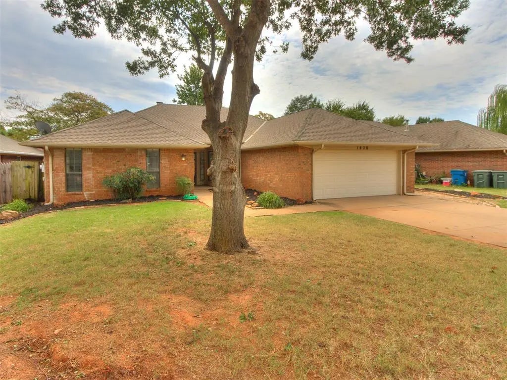 Spacious and well-built, this 2,073 sq. ft. home in the desirable Coppercreek addition in the heart of Edmond and Edmond schools offers timeless quality and endless potential. Featuring 3 bedrooms, 2 bathrooms, and a 2-car garage, the home sits on a beautifully landscaped lot with mature trees and a solid brick exterior. Inside, the formal entry opens to a large dining area with wood parquet flooring that flows into an expansive living room with crown molding, a wood-burning fireplace, and floor-to-ceiling built-ins. Oversized windows and double doors fill the space with natural light and overlook the backyard. The kitchen offers abundant cabinet storage, generous counter space, stainless appliances, a separate dining nook with a picture window, and even a built-in desk area. The spacious primary suite includes an Australian-style bathroom with dual vanities, a soaking tub, separate shower, and two walk-in closets. Secondary bedrooms are generously sized, with one featuring a built-in desk and shelves. The second bathroom includes private vanities with a shared tub/shower area. Well maintained and in excellent condition, this home is ready for your updates and personal touch. Conveniently located in the heart of Edmond near shopping, dining, and top-rated schools.