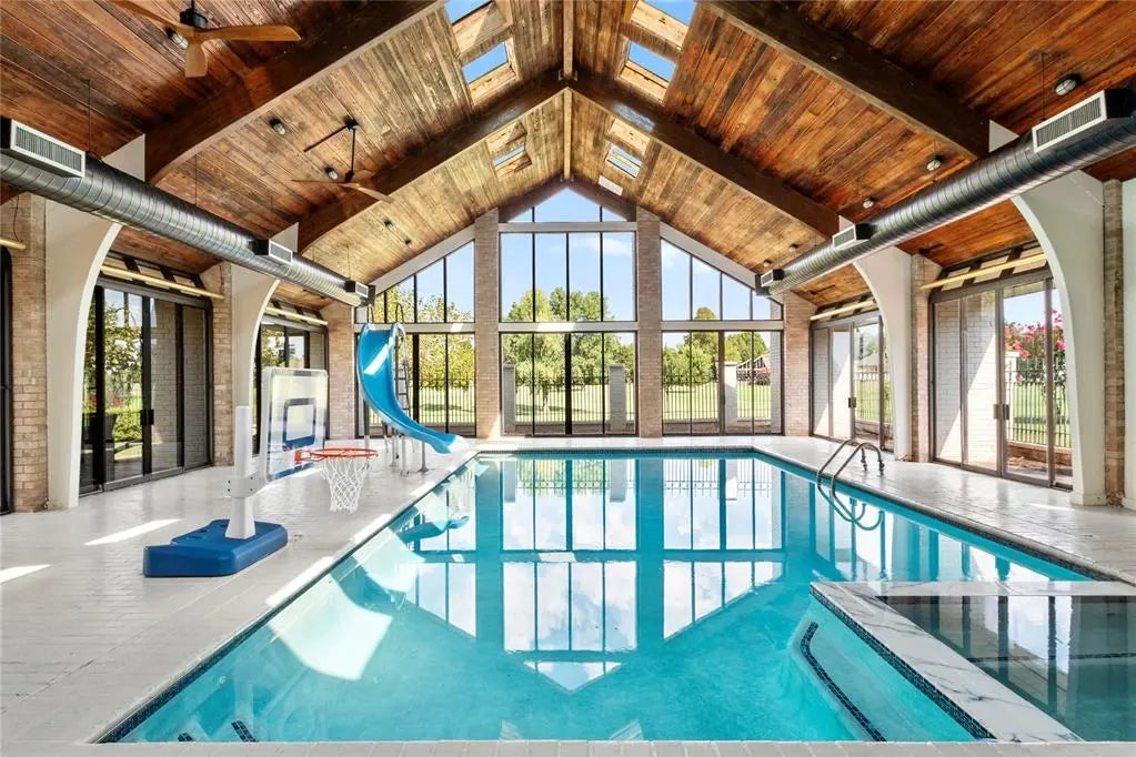 The showpiece is the expansive indoor heated pool with spa, slide, TV, and sound system—a rare feature. Renovated completely in 2024 with new resurfacing, tile, plumbing, and equipment, the pool area also includes its own HVAC and dehumidifier for year-round comfort, plus a full bathroom with shower.