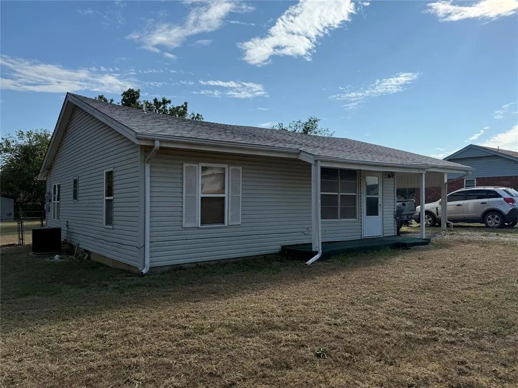 Country sized lot near town with a 2 bedroom, 1 bathroom, frame home on just under 1 acre. The backyard is massive and has a nice, clean, and dry storm shelter along with being chain fenced. Enter into a large living room with kitchen, dining, and interior laundry moving deeper. The kitchen has a lot of cabinet space and is more of an open layout. Move to the left to enter a small hallway area with 2 bedrooms on each side of a nice full bathroom. The home has updated mini splits for heat and air along with a gas wall furnace for a comfy set up when the temperature gets really cold. The 1 car carport is great for covered parking.