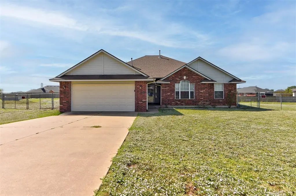 Wide open space on your very own acre in the Circle V Ranch Estates of Piedmont. This home has great possibilities and is priced accordingly. Come home to covered walkway across from garden bed in waiting. Enter to well-designed entry with room for mud area or sideboard. Living room features ceiling fan, large picture window overlooking back yard, and tile front fireplace with wood mantle and accent spot lights above. Kitchen offers ample storage and work space with honey stained wood cabinets and extended counter tops - PLUS breakfast bar. Kitchen also offers 2 separate dining areas with formal dining and breakfast nook - PLUS chrome and black appliances including gas range and built in microwave. AND pantry! Primary bedroom features ceiling fan, extended office alcove or dressing area (again the possibilities are great) - PLUS large walk in closet. Primary bedroom boasts an attached double vanity en-suite bath with jetted tub and separate glass enclosed shower. All bedrooms feature ceiling fans. Main bath is a single vanity with extended counter space and tub/shower combo. Storm shelter outside. Seller fully disclosures that they think the HOA is $105 per year, but is unsure and buyer is to verify. Additional disclosure that seller is related to listing Realtor.
