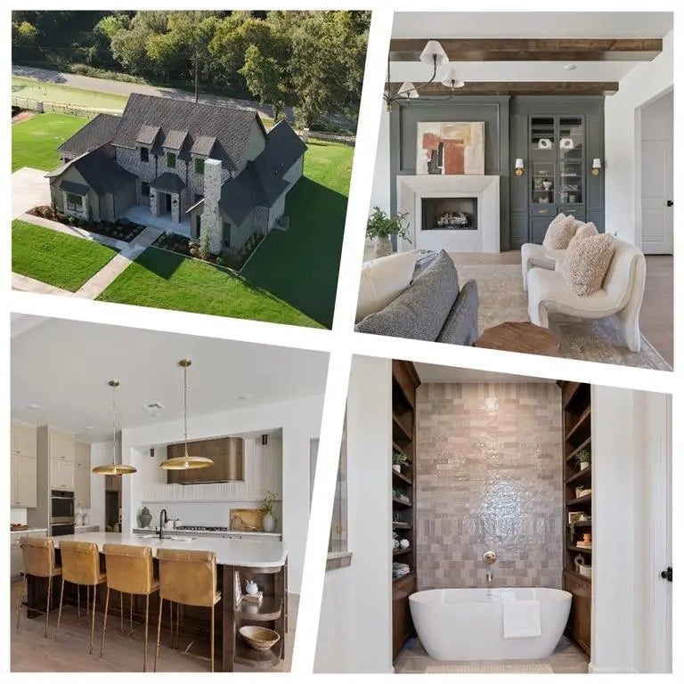 This thoughtfully crafted 2025 Parade home blends classic Tudor architecture with fresh, transitional design. The exterior showcases steeply pitched gables, bronze-trimmed windows, and a rich mix of brick, board-and-batten siding, and stone accents, creating inviting curb appeal. Inside, warm neutral tones, engineered wood flooring, and curated lighting fixtures set a welcoming tone. The open-concept living area features a striking cast stone fireplace, a chef-inspired kitchen with custom cabinetry, and a spacious dining area perfect for everyday living or entertaining. A serene primary suite offers a spa-like bath with designer tile and a soaking tub, while additional bedrooms provide comfortable accommodations for guests. Thoughtful details, from the study’s built-ins to the stylish powder bath, ensure every space is both functional and beautiful. Outdoors, a covered patio invites relaxation year-round.