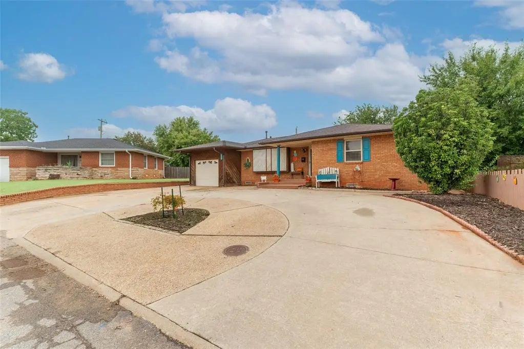 Well-maintained 2,119 square foot ranch-style home in Clinton's Wilson Addition featuring 3 bedrooms, 2 full bathrooms, and versatile bonus room. This single-story brick residence offers recent major upgrades including new roof installed September 2025 and new water heater. Complete home inspection available to prospective buyers upon request. The updated kitchen showcases granite countertops, oak cabinetry, stainless steel appliances, and custom built-in china hutch with extensive display shelving. Exposed wood beams add architectural character throughout. The spacious living room features brick fireplace with decorative tile surround and custom built-in entertainment center. A dedicated laundry room includes custom sage green cabinetry with glass panel inserts. The large master bedroom boasts exposed beam ceiling accents, brick accent wall, and multiple closets. The bonus room provides flexible space for home office, craft room, playroom, or fourth bedroom. Exterior features include circular concrete driveway with multiple parking spaces, single-car attached garage with character wood door, covered front porch with decorative wood trim and turquoise accent column, and private covered rear patio. The large fenced backyard includes mature shade trees. Three separate metal storage buildings.