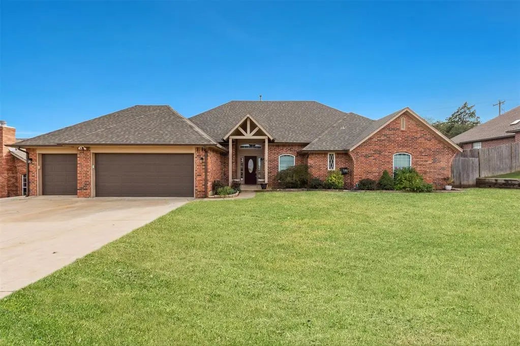 Welcome to this charming home in the desirable Oakwood East Village Addition, located within the highly rated Choctaw/Nicoma Park School District! The exterior is beautifully accented with mature landscaping and shrubs, while the extended driveway provides ample level parking and leads to a spacious three-car garage. Step inside to a welcoming foyer that opens to a versatile flex room perfect for a formal dining, second living space, or home office. Large windows offer a lovely view of the backyard, filling the room with natural light. Beyond this space, you’ll find an open-concept kitchen, dining, and living area designed for easy entertaining and everyday comfort. The kitchen features granite countertops, rich stained cabinetry, stainless steel appliances, and a built-in microwave. A top-of-the-line gas stove framed by a charming brick surround adds warmth and character. The oversized pantry with sleek sliding doors is both stylish and functional. The living room is inviting and cozy, centered around a brick fireplace with a classic wood mantle. Wood laminate and tile flooring flow seamlessly throughout the home, complemented by updated lighting and window blinds. The primary suite is a private retreat, featuring a barn door entry to a beautifully updated ensuite bathroom with a dual-sink granite vanity, a distinctive shower/tub combo, and a thoughtfully designed walk-in closet. 3 additional bedrooms are generously sized and offer great closet space. The laundry room comes fully equipped with a stackable washer and dryer, plenty of storage, and a utility sink for added convenience. Out back, the covered patio provides the perfect spot for outdoor living and relaxation. The above-ground pool, partially built into the ground with a sturdy deck, makes summer days effortless and fun. With mature trees lining the back of the property, you’ll enjoy privacy and a serene natural backdrop. A shop/storage shed is also included, adding extra versatility and functionality.